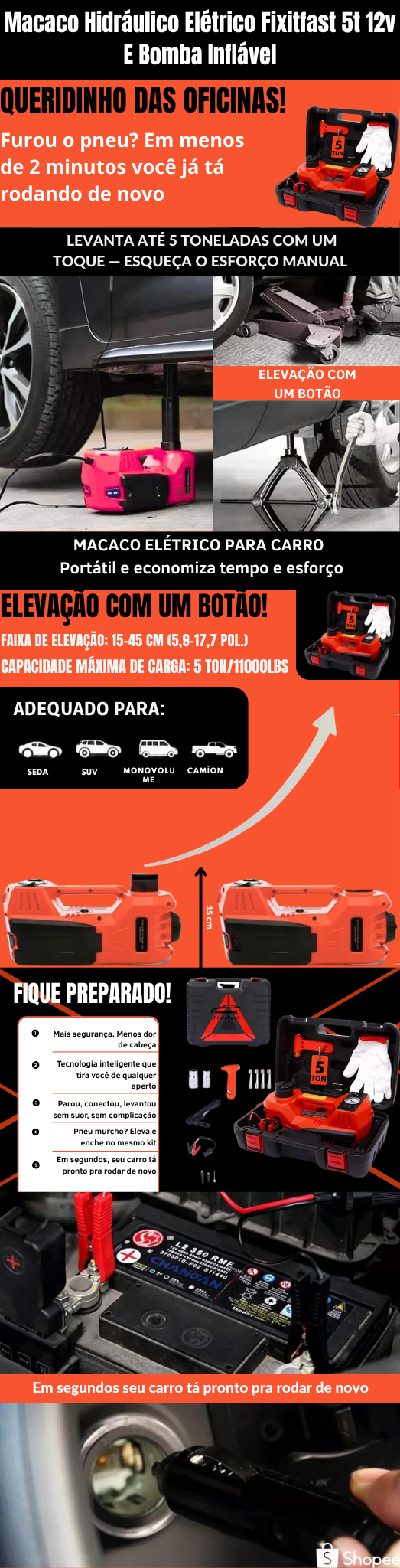 Macaco Hidráulico Elétrico Fixitfast 5t 12v E Bomba Inflável